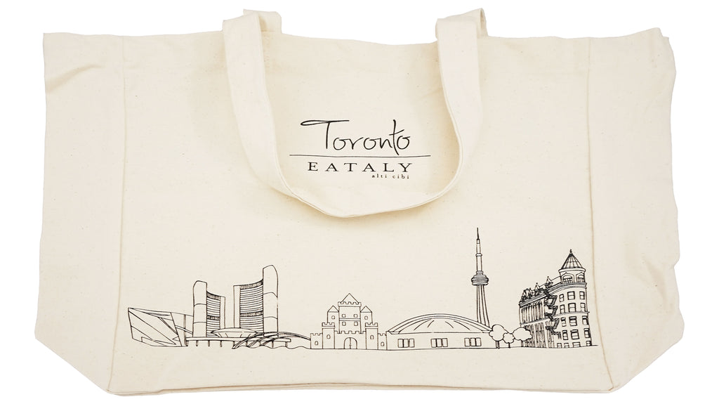 The Eataly Toronto Canvas Bag is a stylish yet simple canvas bag with a Boston cityscape-inspired illustration on it, to take with you everywhere you go.Use this instead of plastic bags when you shop - you'll look great, and the environment will thank you, too!