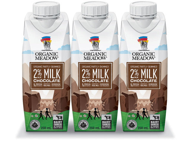Organic Meadow's 2% Chocolate Milk is pasteurized and made with 100% Canadian milk.